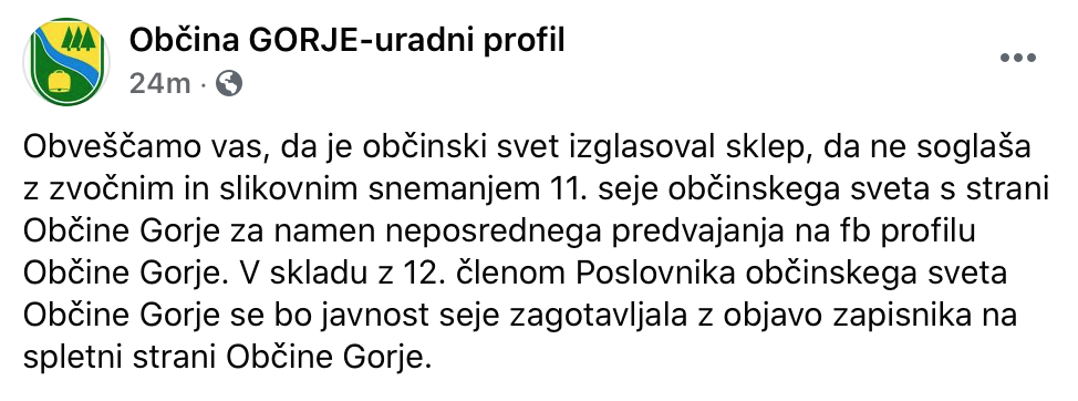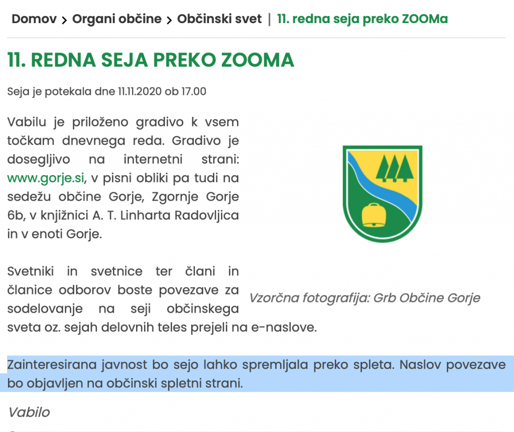 V najavi 11. redne seje občinskega sveta Občine Gorje izrecno piše: »Zainteresirana javnost bo sejo lahko spremljala preko spleta. Naslov povezave bo objavljen na občinski spletni strani.«