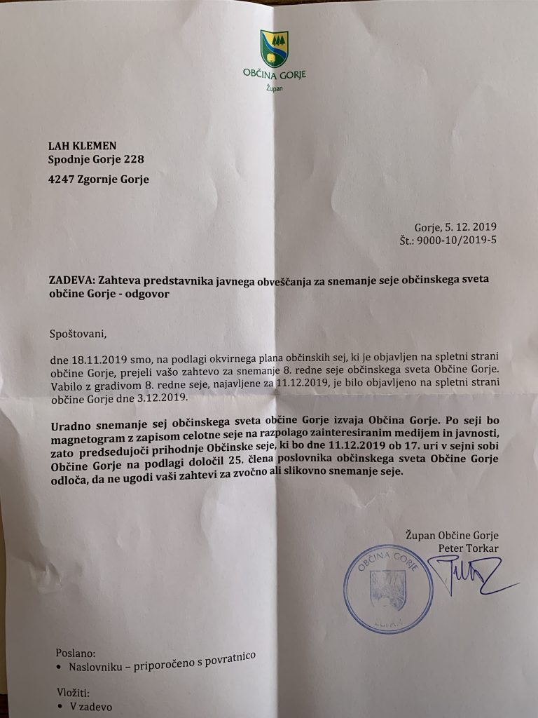 Čeprav je župan v odgovoru na zahtevo predstavnika javnega obveščanja za snemanje seje občinskega sveta občine Gorje odgovoril, da »Uradno snemanje sej občinskega sveta občine Gorje izvaja Občina Gorje. Po seji bo magnetogram z zapisom celotne seje na razpolago zainteresiranim medijem in javnosti…« pa kljub temu, da od seje mineva 29 dni, od zaprosila nekaj dni kasneje pa 25 dni iz strani občine pa ne samo, da nismo prejeli magnetograma in zvočnega zapisa, ampak niti odgovora. (celoten odgovor si lahko preberete na koncu objave).