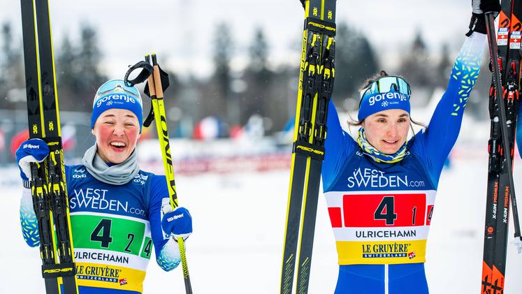 Slovenski smučarski tekačici Eva Urevc in Anamarija Lampič sta zmagali na ekipni sprinterski tekmi za svetovni pokal v Ulricehamnu na Švedskem. To je sploh prva