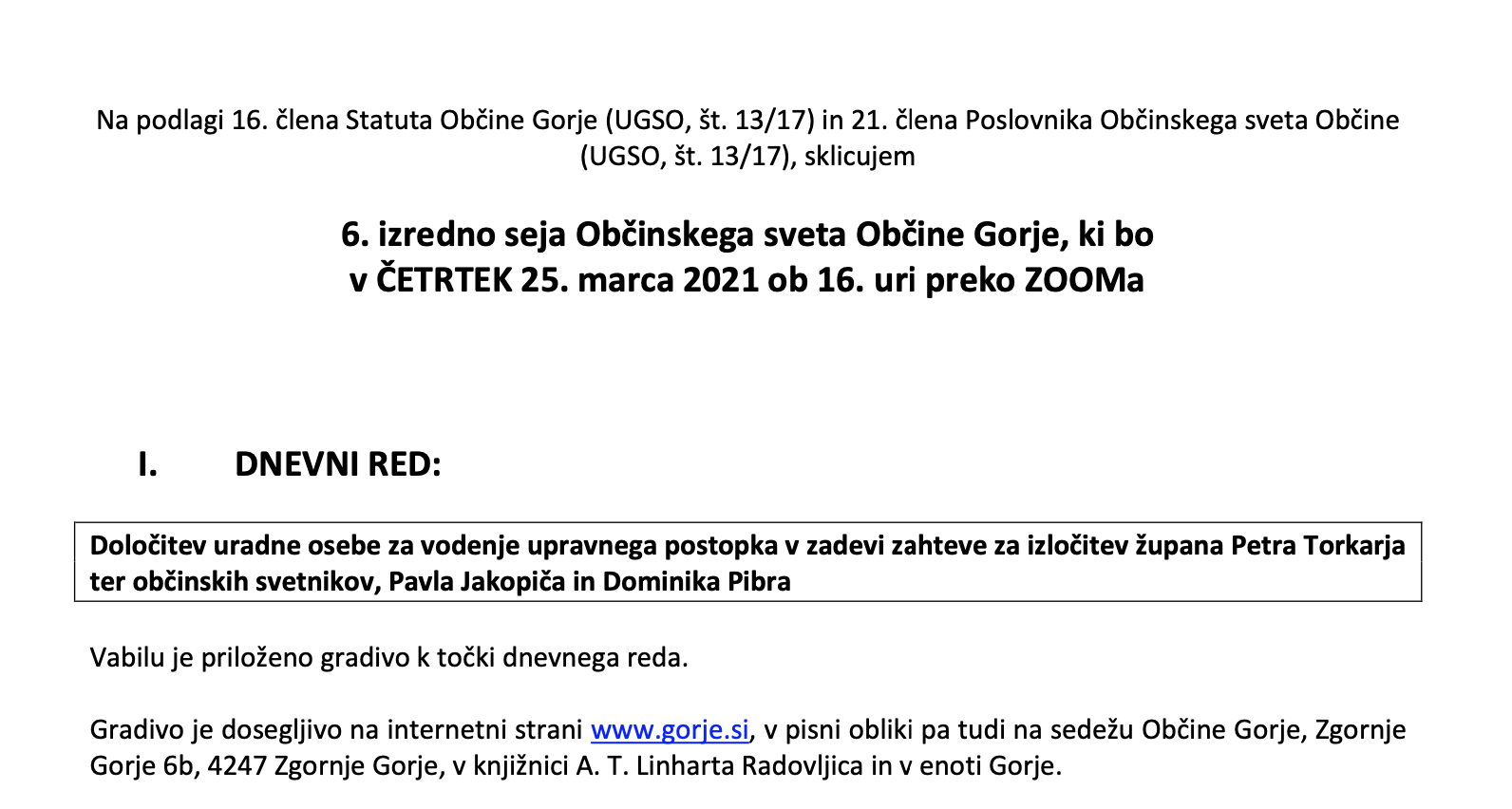 Sklicana je izredna seja zaradi izločitve župana Petra Torkarja in svetnikov Pavla Jakopiča ter Dominika Pibra v zadevi “Odločanje o sprejemu koncesijskega akta za vlečnice