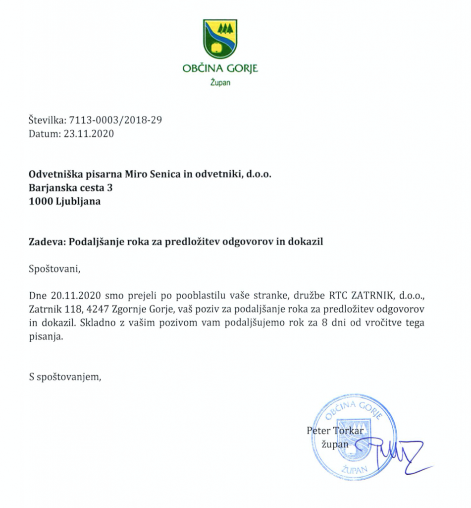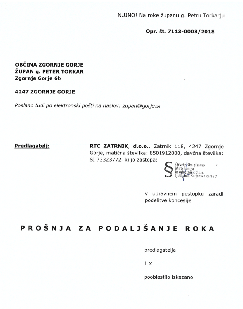 Družba RTC Zatrnik d.o.o. je preko odvetniške pisarne Miro Senica in odvetniki d.o.o. vložila prošnjo za podaljšanje roka z obrazložitvijo, da postavljeni rok glede na obseg zastavljenih vprašanj objektivno neprimeren in prekratek, saj količina in število vprašanj, predlagatelju onemogočata pripravo kvalitetnih in vsebinskih odgovorov.